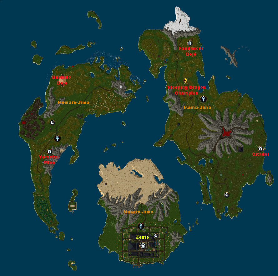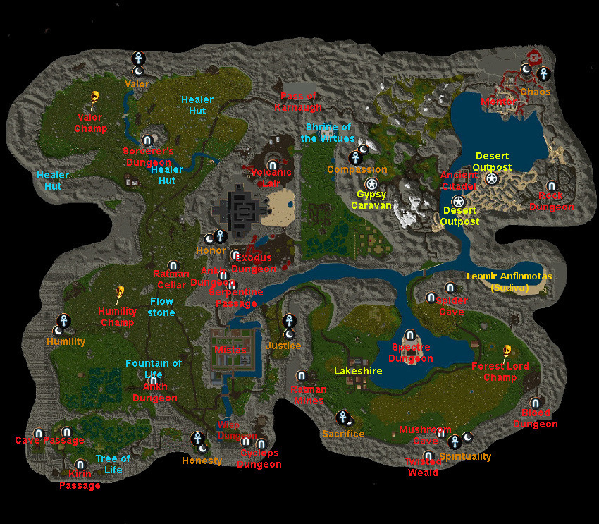 Poniżej zamieszczam aktualną mapę kontynentu Felucca wraz z naniesionymi dungeonami. W przypadku jakichkolwiek zmian w tym zakresie, będzie ona aktualizowana. Przypominam, iż decyzją samych graczy na shardzie naszym serwerze nie funkcjonuje kontynent Malas a wejścia do dungeonów tego regionu przeniesiono na inne, istniejące kontynenty (głownie na Felucca).